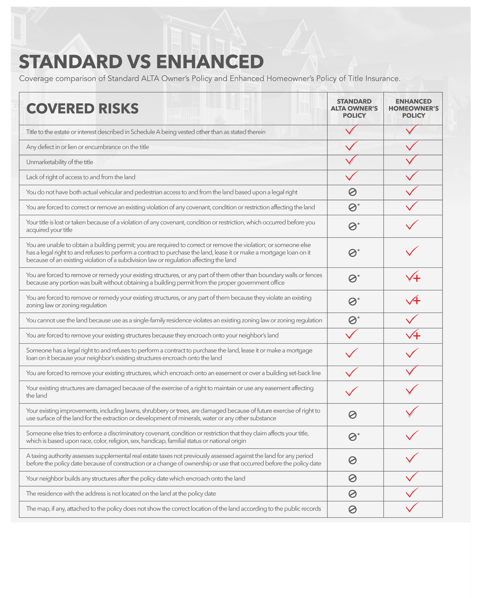 Understanding the differences between a Standard and Enhanced Title Insurance Policy is a critical to ensuring the right protection on your investment. The following chart breaks down the differences so you can make an informed decision.
